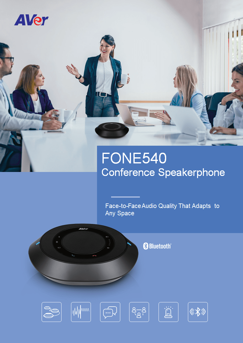 The AVer FONE540 is a daisy-chainable USB speakerphone that enhances your audio-conferencing experience in personal workspaces, huddle rooms, and medium-to-large conference rooms. Easy to plug in, install, and use, the FONE540 supplies business-class acoustics without creating extra work.